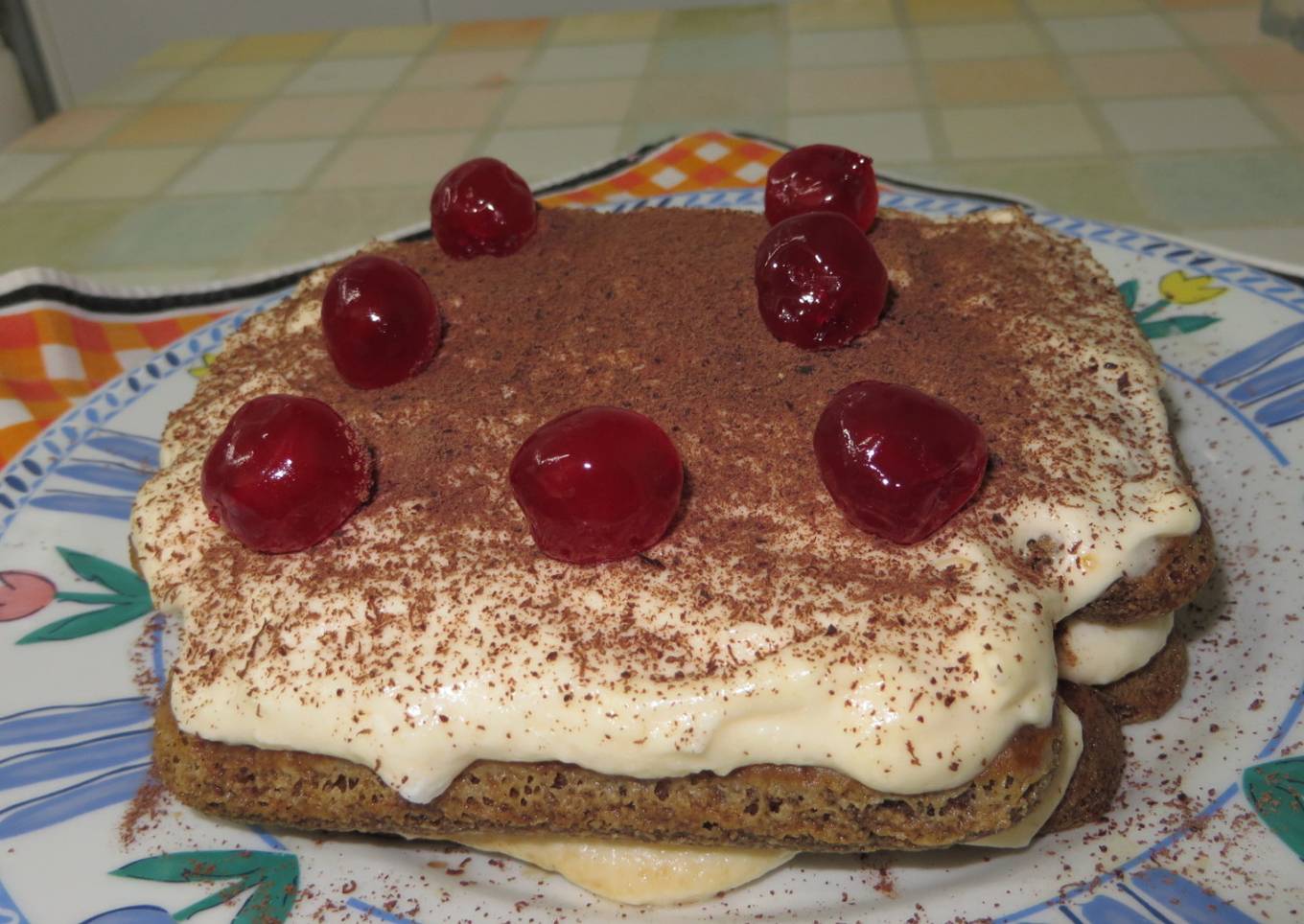 - En una bandeja colocar una capa de bizcochos embebidos en café, cubrir con una capa de crema (la mitad) poner por encima cacao en polvo, otra de bizcochos embebidos, terminar con otra capa de crema.
