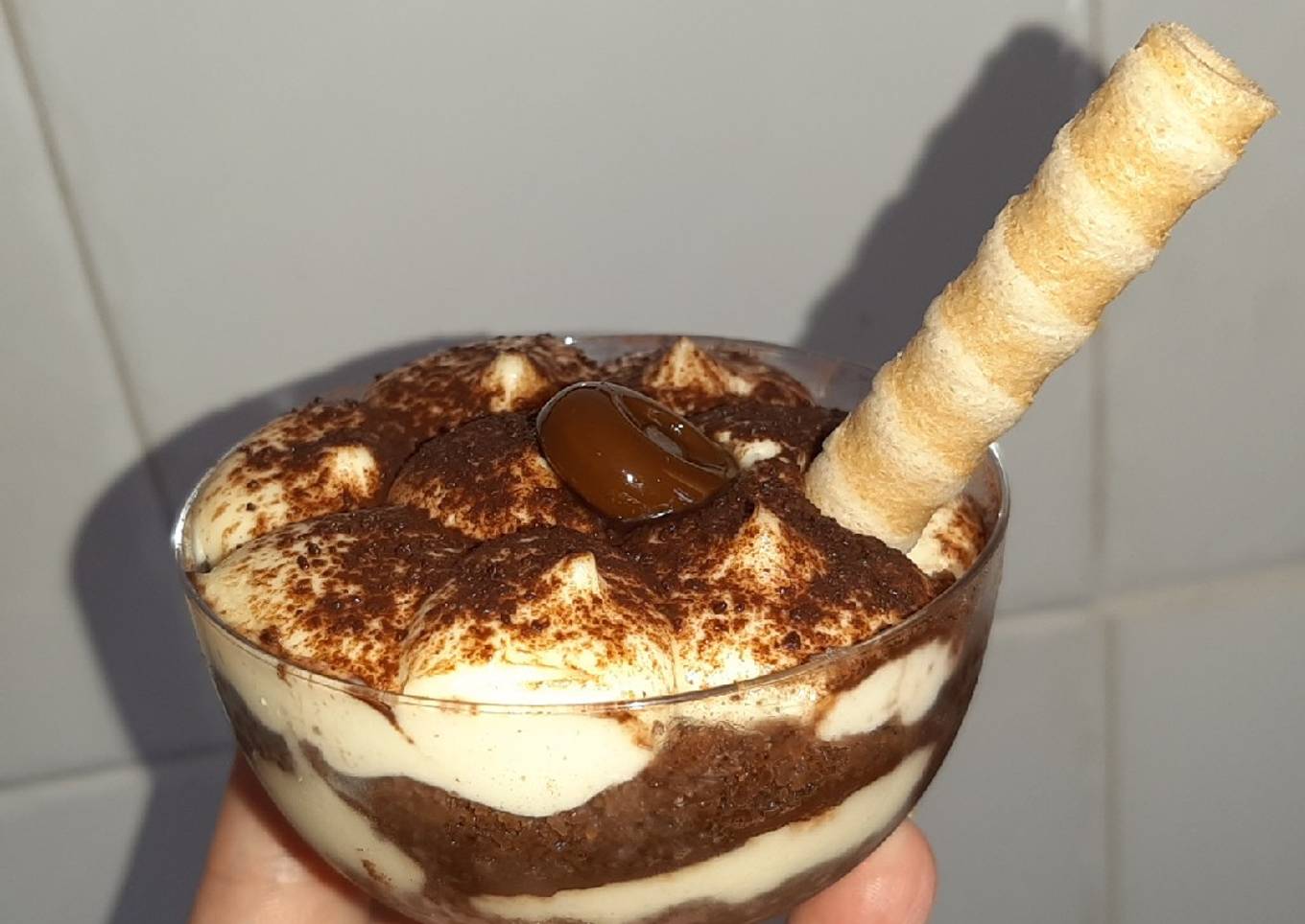 - Machacamos el bizcocho colocamos una cantidad necesaria en una bandeja o vasitos individuales, lo mojamos con el café, hacemos sobre el bizcocho una capa de crema siguiéndole con el cacao puro y así, hasta que se acabe la crema, reservar en la nevera y servir el día siguiente