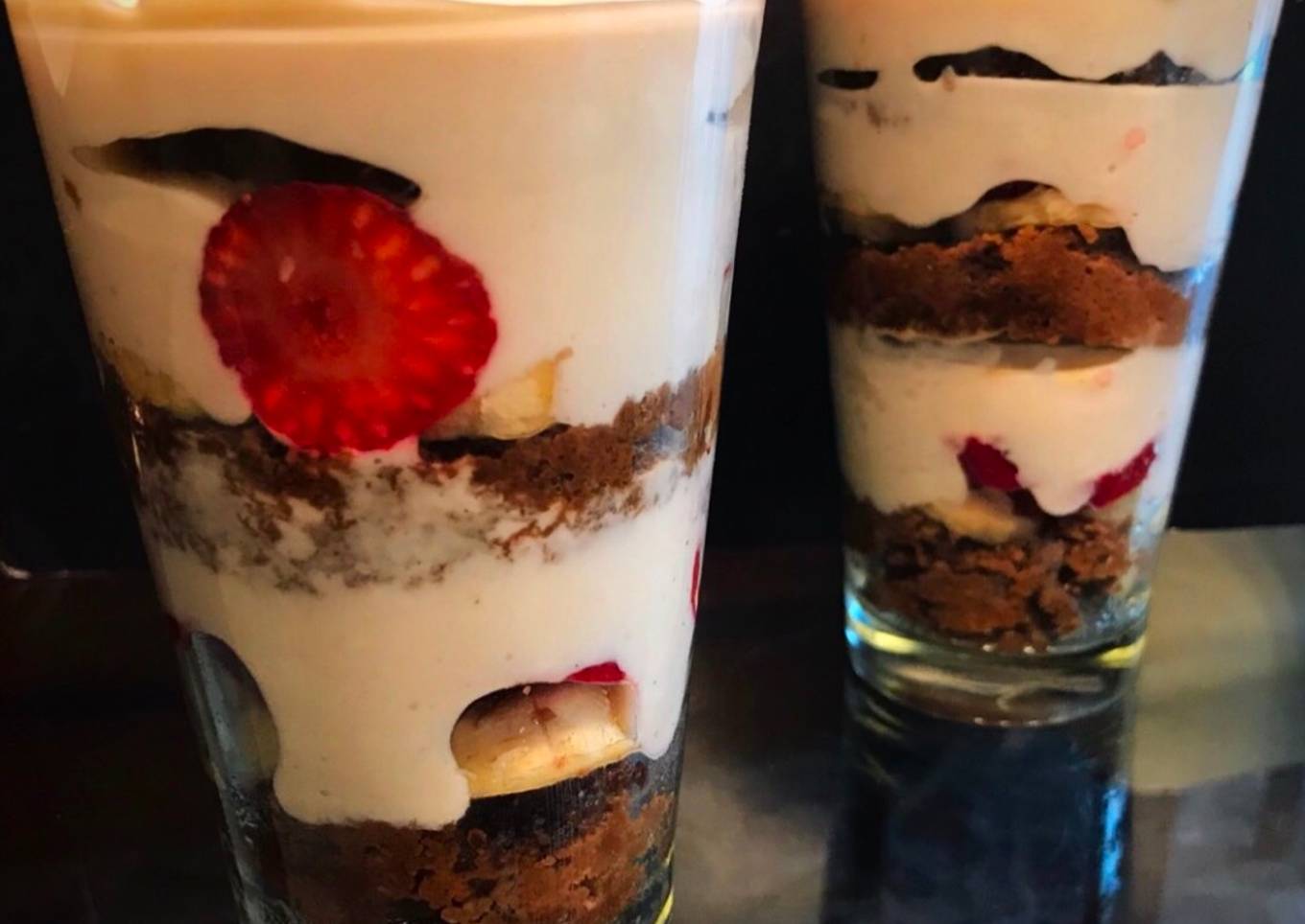 - Mezclar el yogurt con el queso crema el edulcorante y la esencia de vainilla. En un frasco intercalar capas de bizcocho de café, rodajas de banana, frutillas y crema. No olvides seguirme en Instagram @cocinacaseraya