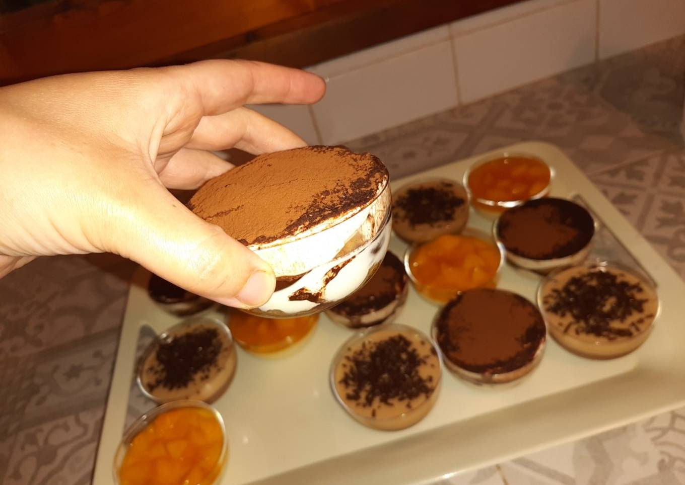- Mojamos los bizcochitos en el café y colocamos en una bandeja o vasito y hacemos una capa de bizcocho, le sigue la crema, después espolvorear con el cacao,