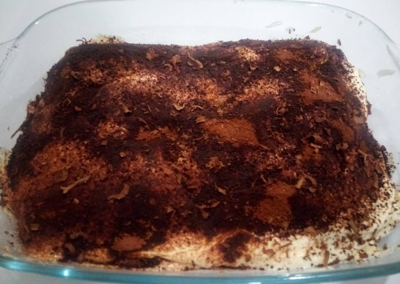 - Para montar, mojamos los bizcochos en el café y lo ponemos de base. Seguidamente cubrimos los bizcochos con la crema que tenemos reservada y espolvoreamos con cacao. Volvemos a poner otra capa de bizcochos mojados con el café y echamos otra capa de crema. Espolvoreamos otra vez con el cacao con ayuda de un colador y finalmente echamos unas ralladuras de chocolate negro por encima.