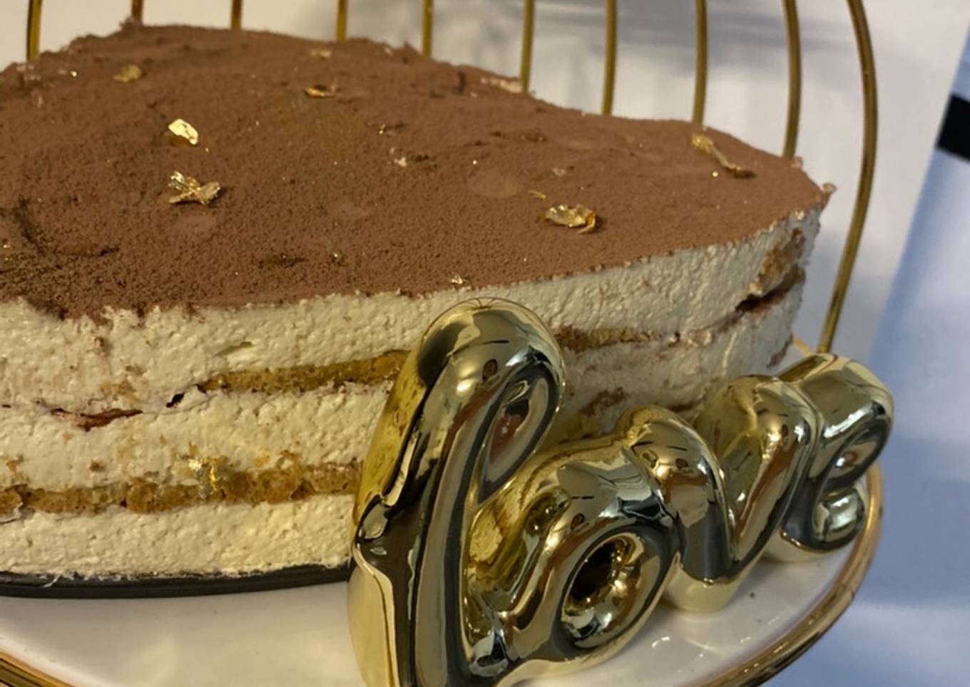 - Ya pasado el tiempo vamos a desmontar nuestro tiramisu de la base y decoraremos con cocoa en polvo y pedazos de papel de oro comestibles