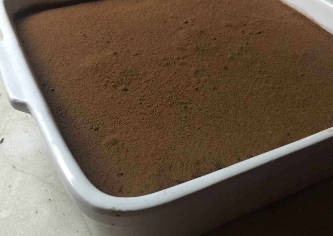 - Pasar las plantillas por el café negro y colocarlas en una fuente, cubriendo toda la base. Colocar una capa de la mezcla del queso arriba de las plantillas. Expandir. Con un colador espolvorear el cacao por toda la superficie.