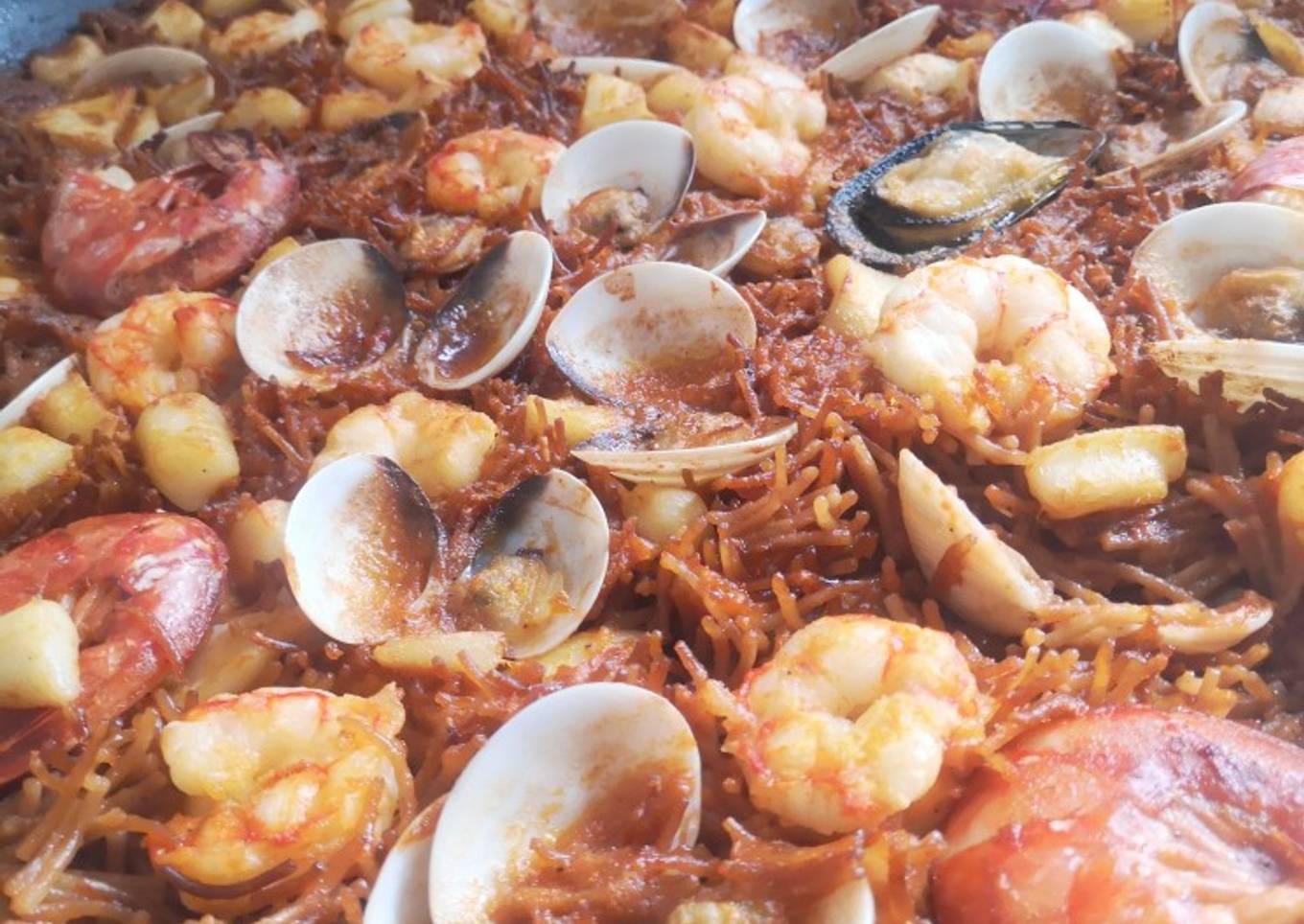 - Corta bien la sepia y el calamar y frielo en la paellera junto con las gambas peladas, una vez veas que está bien echo, echa los fideos y el sofrito, remueve todo bien hasta que veas que todos los fideos están bien cubiertos con sofrito.