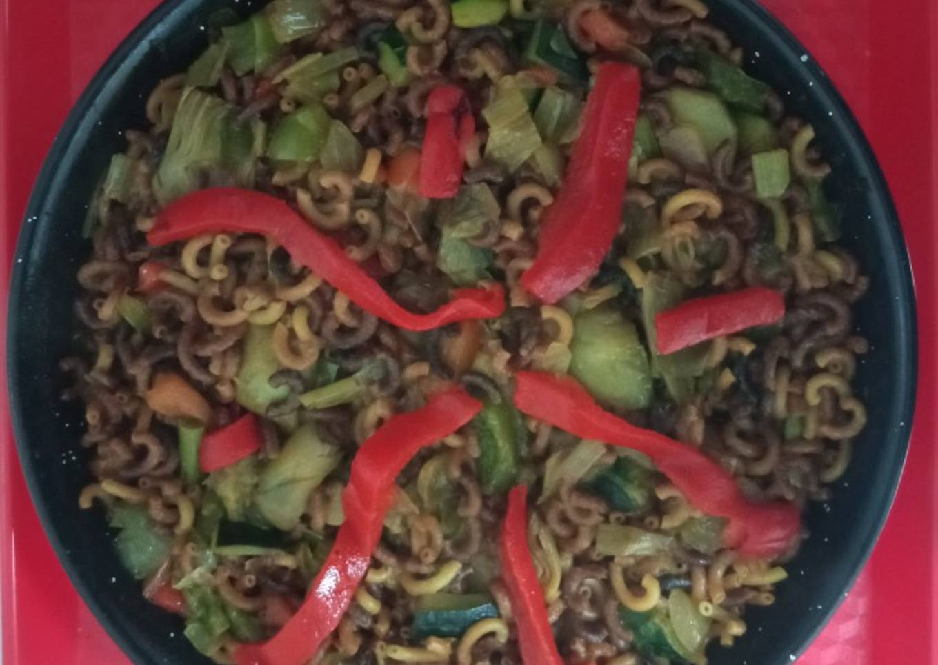 - Cuando estén bien hechas añadimos los fideos, removemos, añadimos la salsa de soja (6 cucharadas) removemos y por último añadimos tres vasos de agua, lo dejamos a fuego alto hasta que hierva, luego lo bajamos a fuego bajo 12 minutos, cuando está apagamos el fuego y