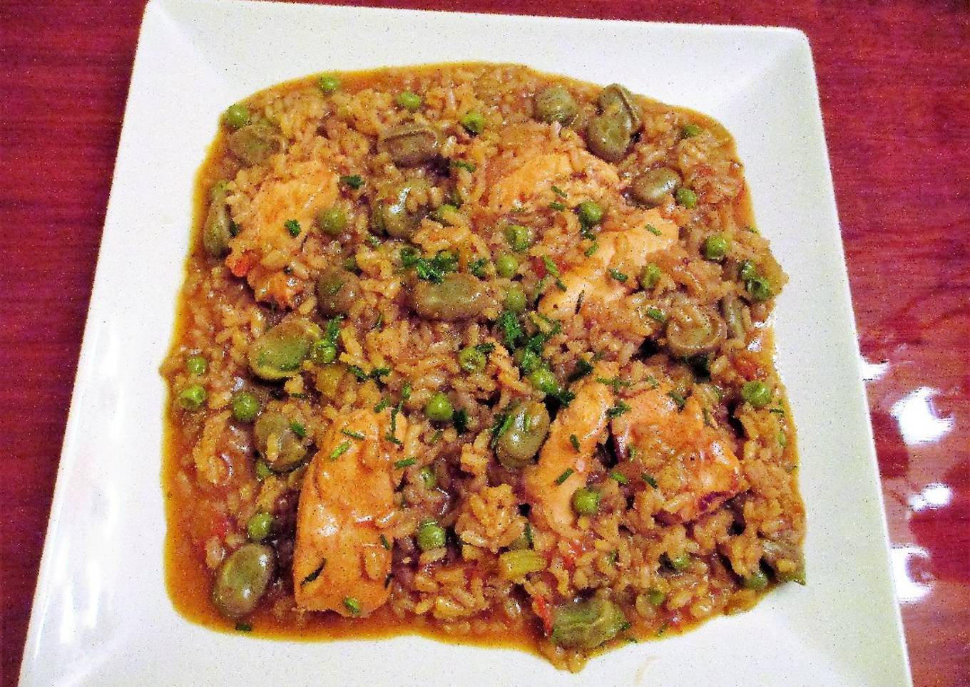 Arroz caldoso con pechuga de pollo, habas y guisantes congelados