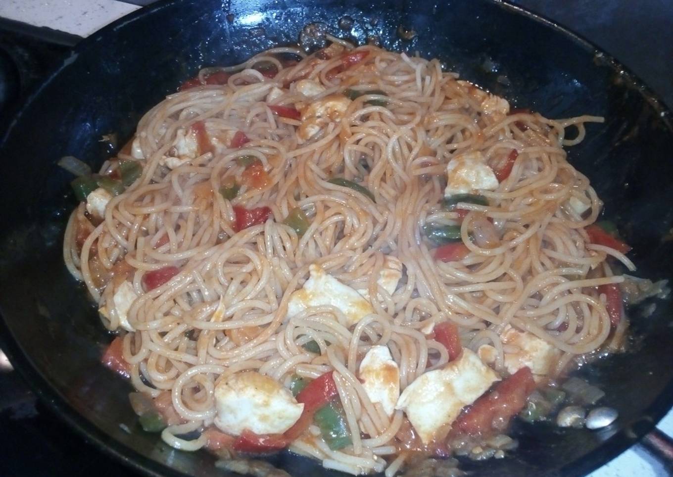 Espaguetis con verduritas y pechuga