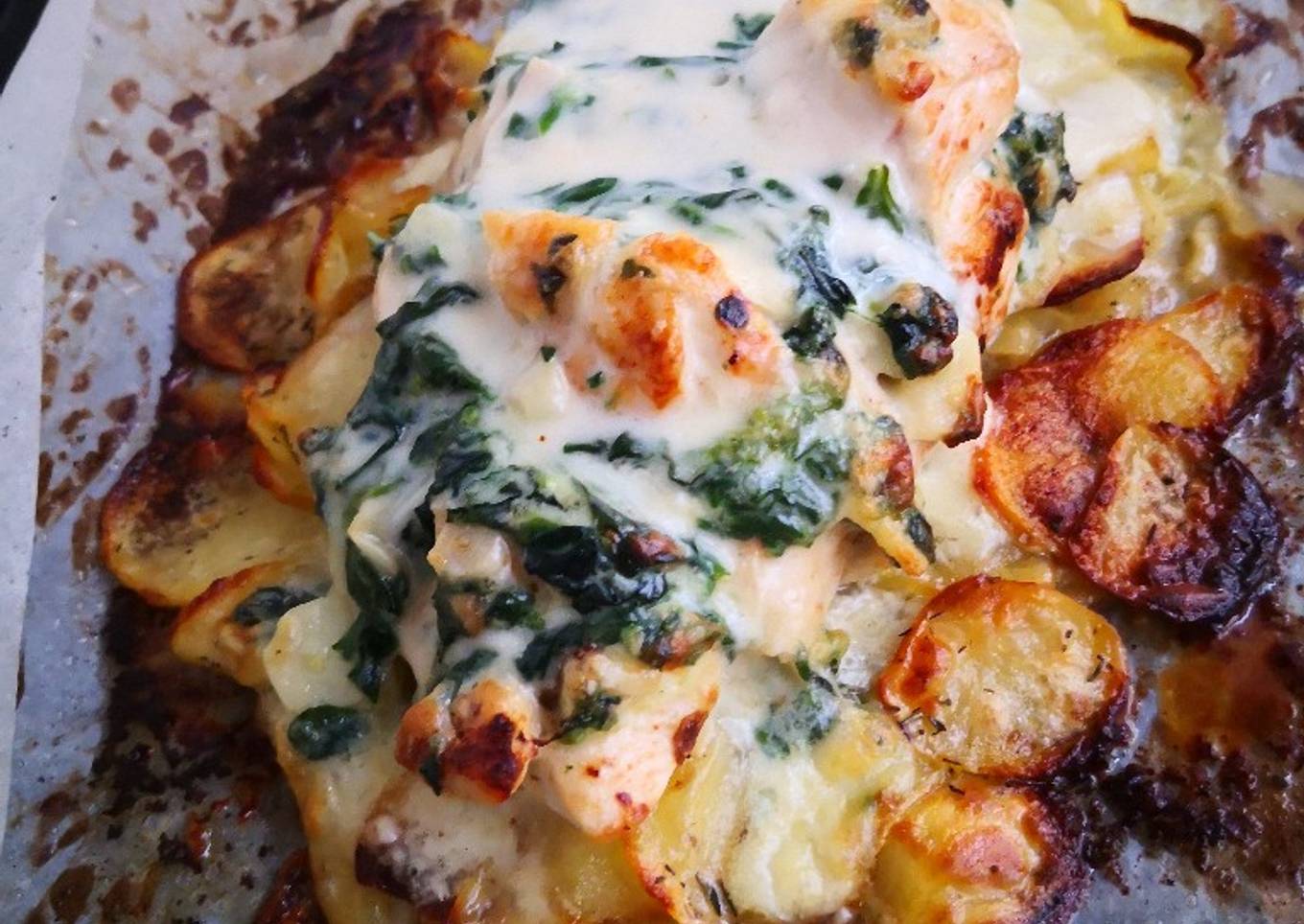 Pechuga rellena de espinacas y gorgonzola en cama de papas