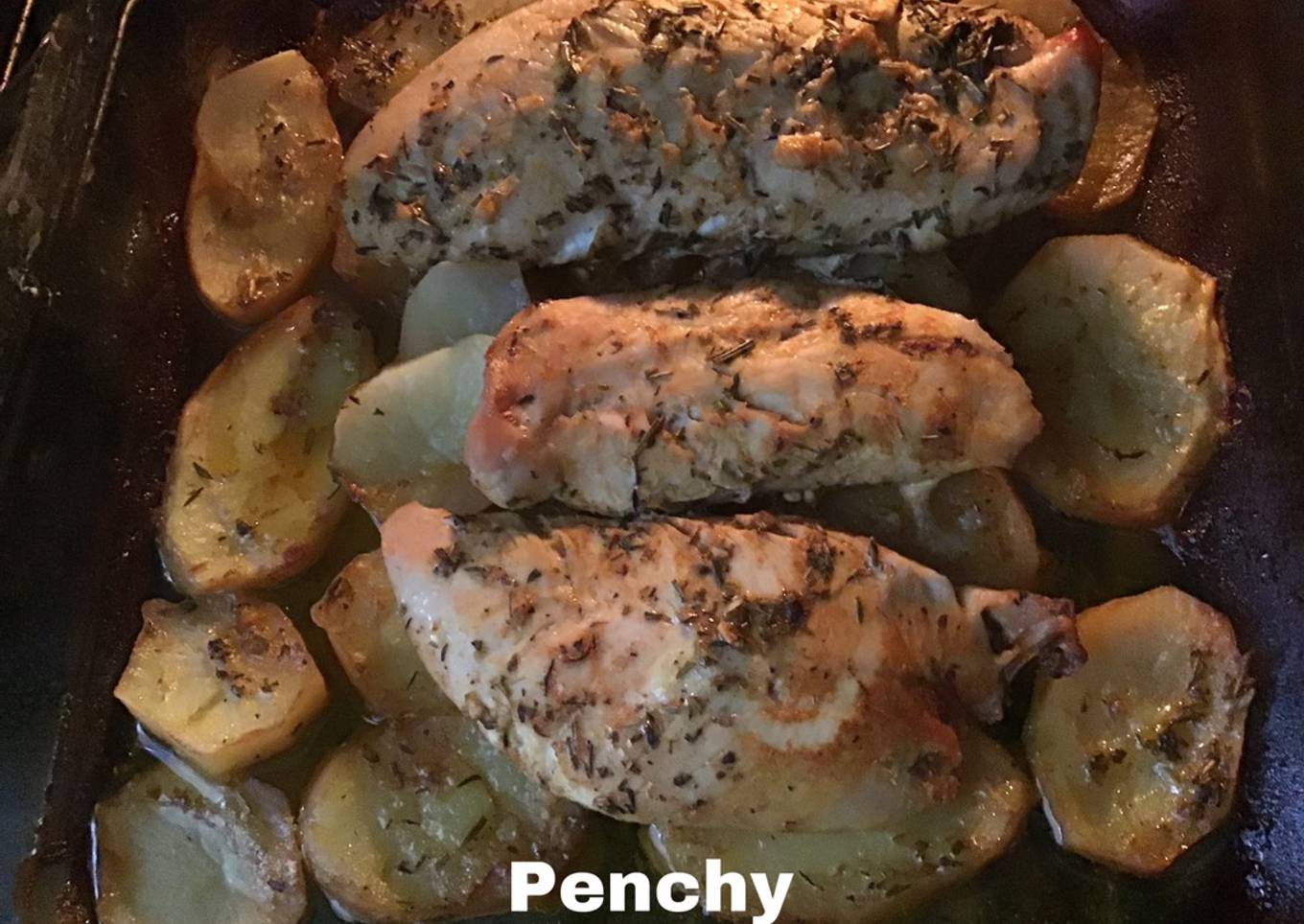 - Pasado este tiempo ponemos en una fuente de horno las patatas lavadas y troceadas, colocamos encima las pechugas y pasamos el adobo por el colador, y cogemos las especias, almendras, etc, y espolvoreamos por encima de la carne y patatas, salpimentamos y regamos con vino blanco y aceite de oliva Virgen extra. Metemos al horno precalentado a 180 grados, en la parte central, dejamos hacer 45 minutos aproximadamente.