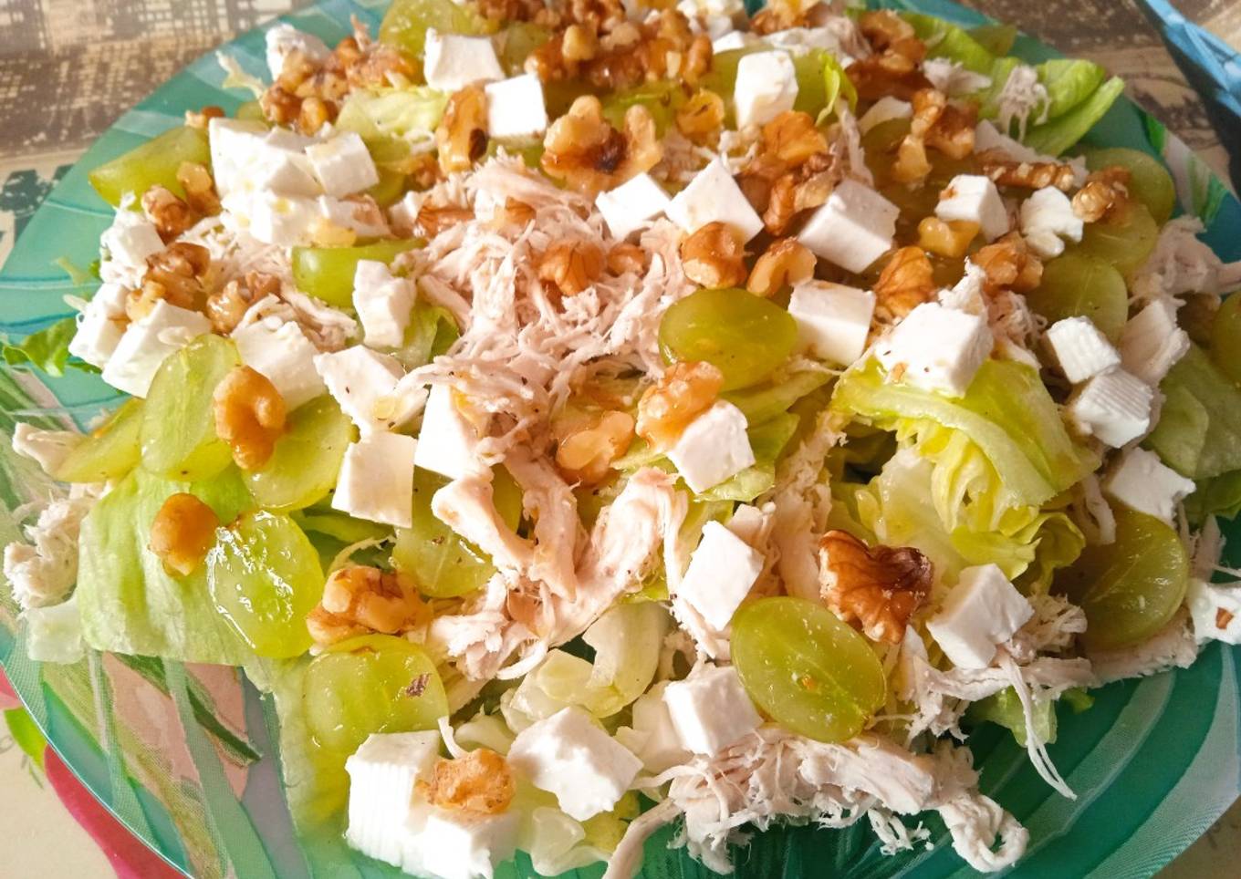 - Repartir en los platos la lechuga y encima repartir el pollo, las uvas partidas por la mitad, el queso en cubitos o láminas finas y unas nueces.